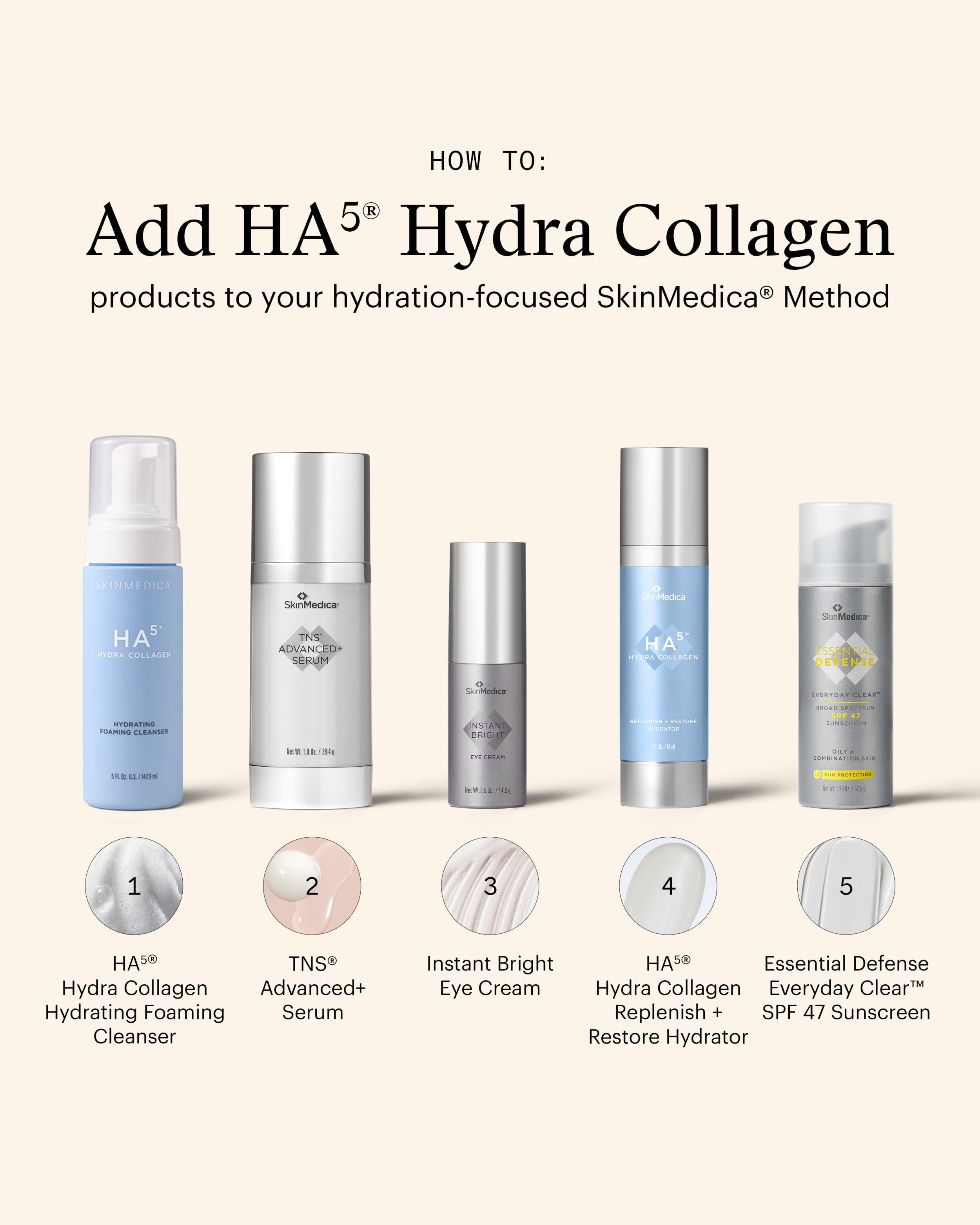 Because HA5 is a “water-loving” substance, wet your fingertips prior to applying HA5 to your skin. Dispense 1-2 pumps of cleanser into the palm of the hand. Apply by gently massaging with circular motions to create lather. Rinse thoroughly with warm water and pat dry. Avoid getting in eyes. If contact occurs, rinse eyes thoroughly with water. Leaves your visage feeling youthful and refreshed. Get the most out of your skin care routine by learning the best order to apply your SkinMedica products in.