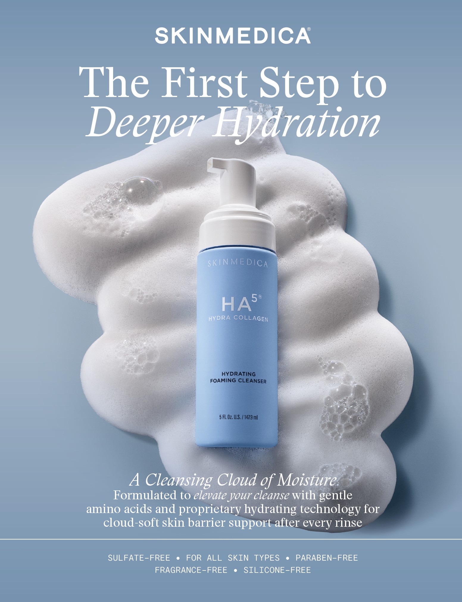 This unique blend features five forms of hyaluronic acid and Hydra Collagen that saturate the skin with moisture instantly. The rich texture sparkles upon contact and helps refresh and maintain pH levels with every use. The HA5 Hydra Collagen Hydrating Foaming Cleanser effectively removes makeup and impurities while delivering a wave of hydration, leaving the skin feeling clean, calm, and exceptionally soft.