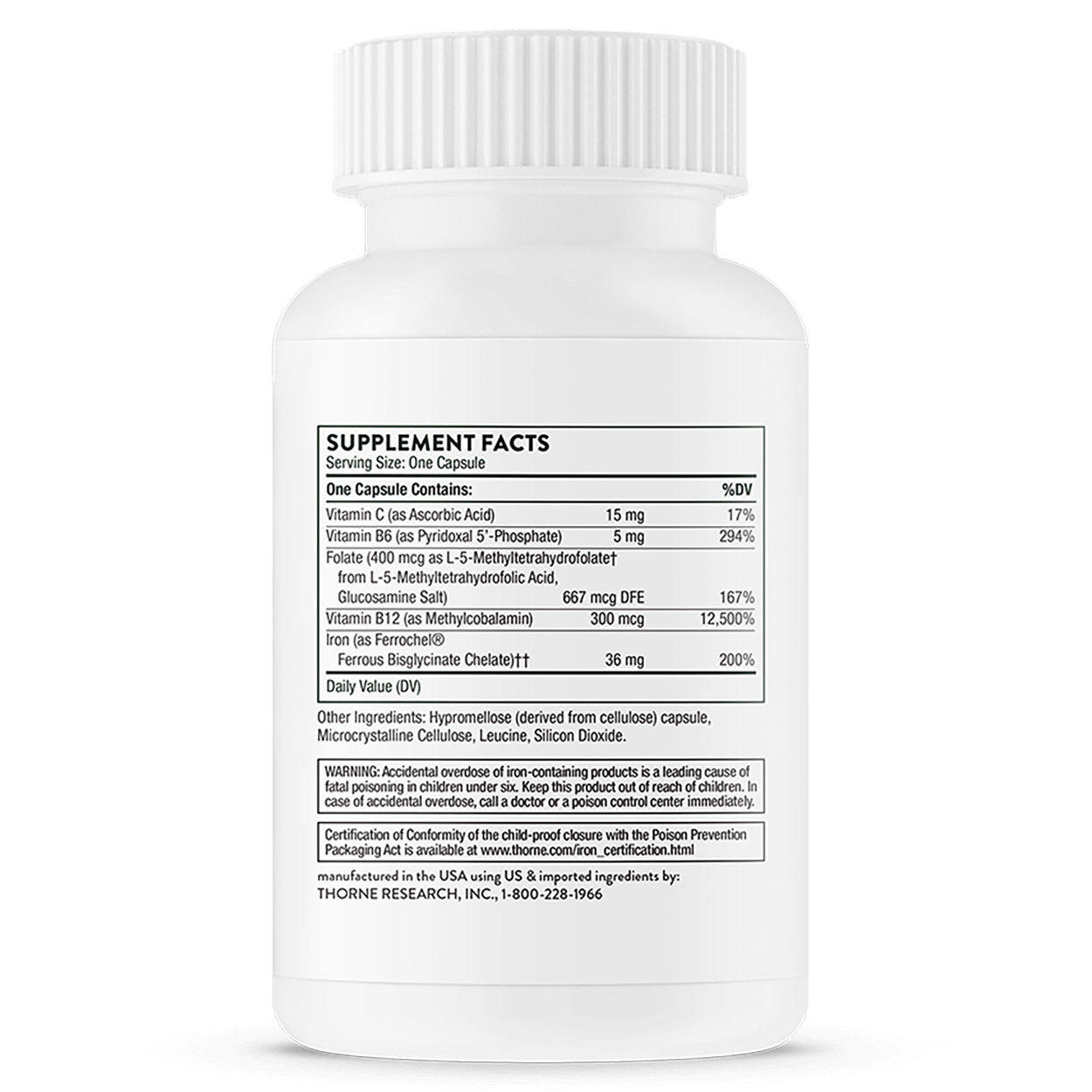 Thorne Advanced Iron Complex rebuilds iron stores to support healthy hemoglobin and red-blood-cell production, improving oxygen transport for steadier energy, clearer focus, and better exercise tolerance. Consistent use can reduce symptoms of low iron—fatigue, cold hands/feet, shortness of breath with exertion—so daily life and workouts feel easier.