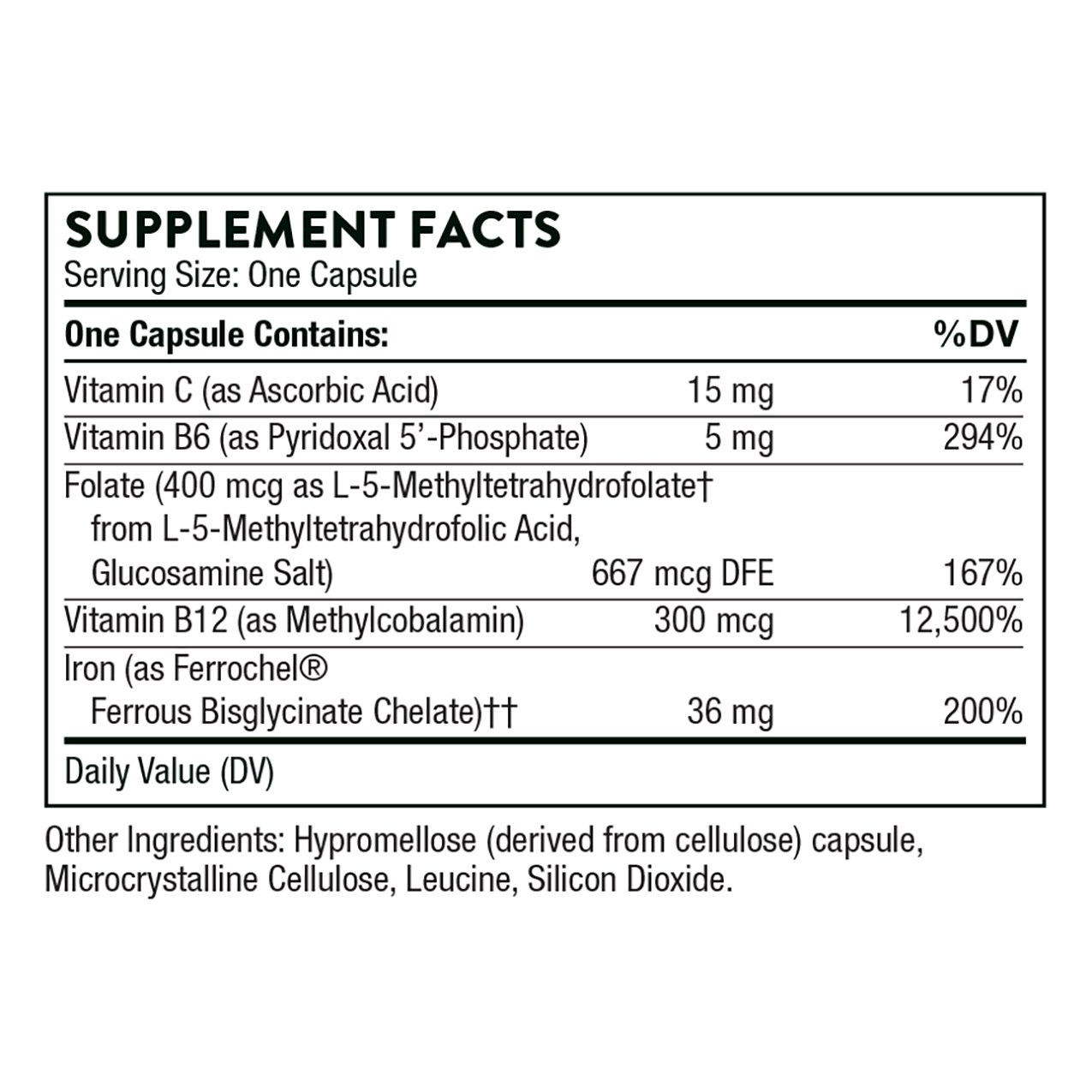 DBuilt-in vitamin C enhances iron uptake, while methylated B12 and folate support red-blood-cell maturation; copper helps balance iron transport and utilization. Together, these cofactors accelerate repletion and help maintain healthy ferritin and hemoglobin—ideal for athletes, menstruating women, and anyone with increased iron needs under a clinician’s guidance.