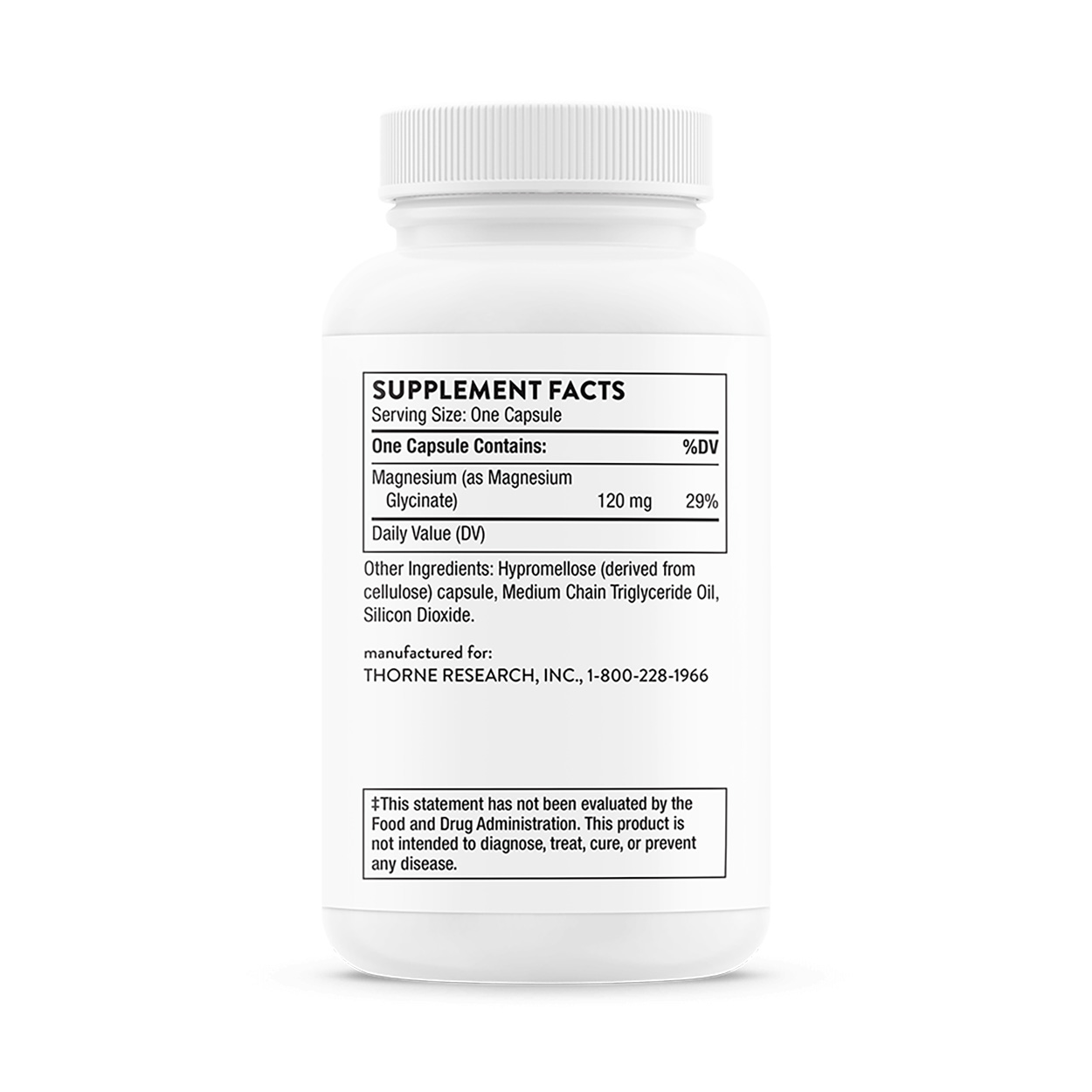Thorne Magnesium Glycinate provides a highly absorbable form of magnesium bisglycinate chelate, which supports calm nerves, deeper sleep, steady energy production, muscle recovery, and a healthy heart rhythm—without the laxative effect that is often associated with lesser-quality forms of magnesium. The gentle, gut-friendly glycinate form is bound to the amino acid glycine, enhancing absorption and promoting relaxation, making it ideal for evening use or post-training recovery. Thorne’s formula is verified for purity and is free from gluten, dairy, and soy. It can be easily combined with a multivitamin, omega-3s, and vitamin D to support overall wellness and stress resilience. delivers highly absorbable magnesium bisglycinate chelate to support calm nerves, deeper sleep, steady energy production, muscle recovery, and healthy heart rhythm—without the laxative effect common to inferior forms. The gentle, gut-friendly glycinate form is bound to the amino acid glycine to enhance uptake and promote relaxation, making it ideal for evening use or post-training recovery. Verified for purity and free of gluten, dairy, and soy, Thorne’s clean formula layers easily with a multivitamin, omega-3s, and vitamin D to round out daily wellness and stress resilience.