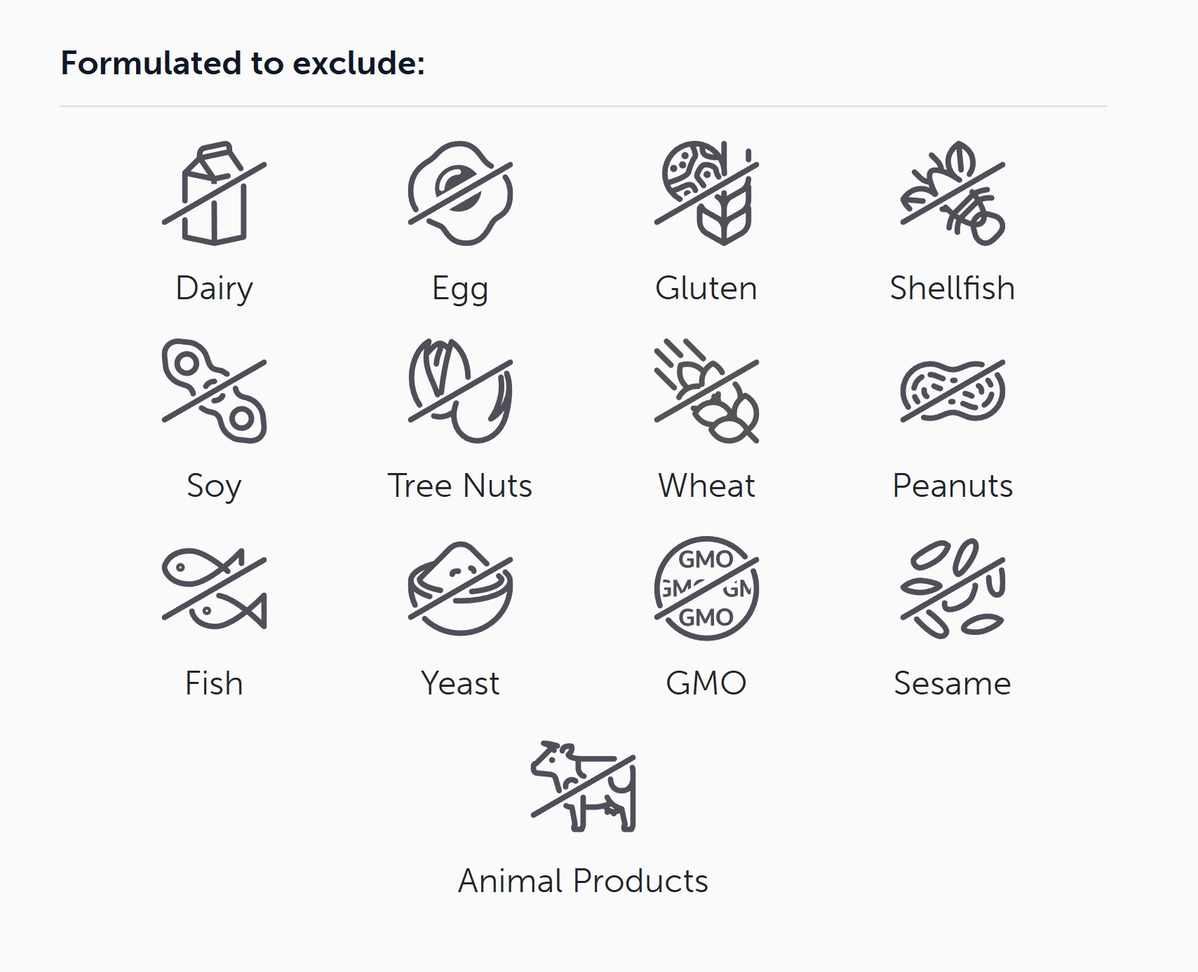 Formulated to exclude wheat, gluten, yeast, soy, animal and dairy products, fish, shellfish, peanuts, tree nuts, egg, sesame, GMO ingredients, artificial colors, and artificial sweeteners.