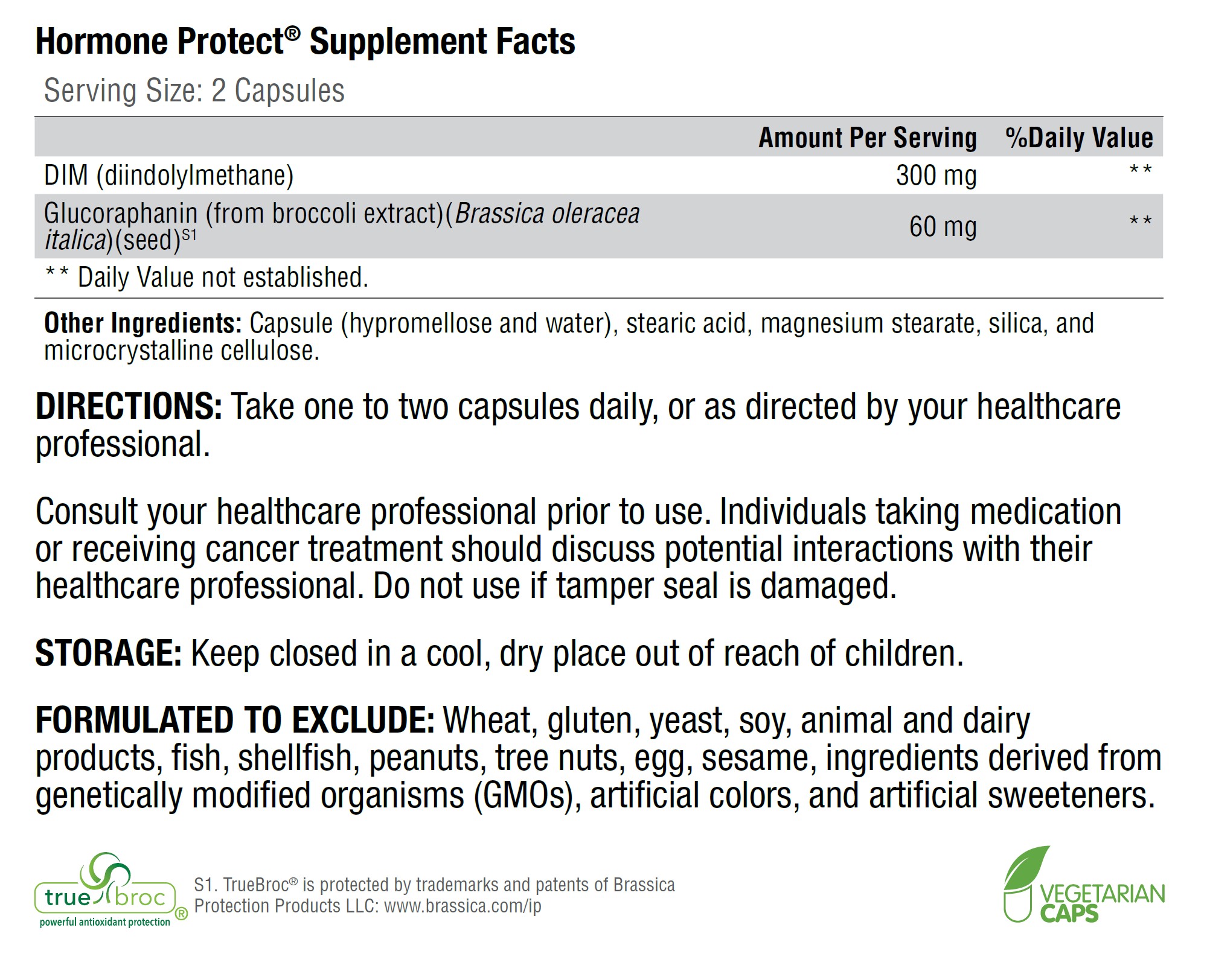 Many DIM supplements provide DIM alone. Hormone Protect adds TrueBroc® glucoraphanin, giving you both estrogen metabolism support (DIM) and sulforaphane-precursor support for detox and antioxidant protection.