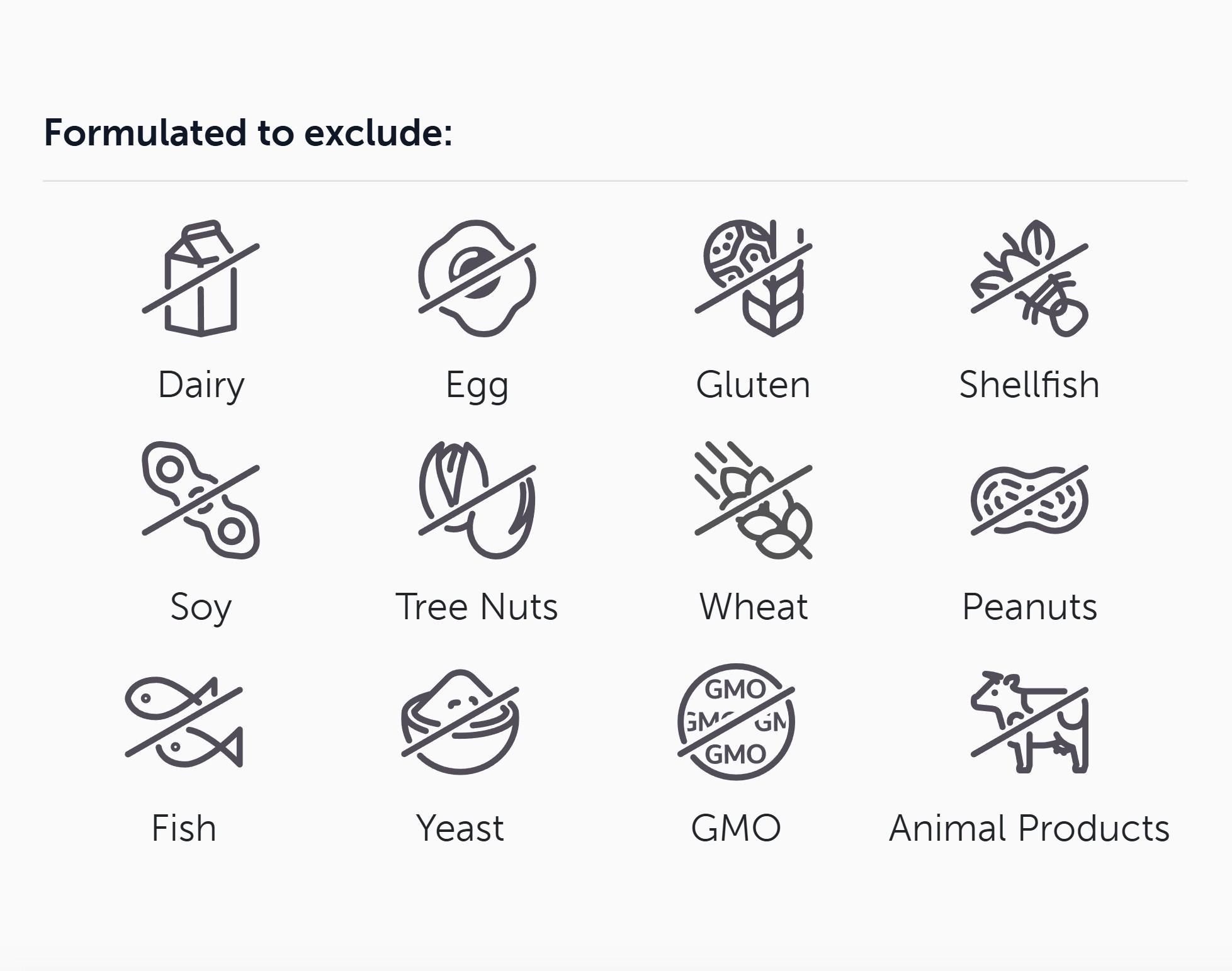 Formulated to exclude animal products, dairy, egg, fish, gluten, GMOs, peanuts, shellfish, soy, and tree nuts.